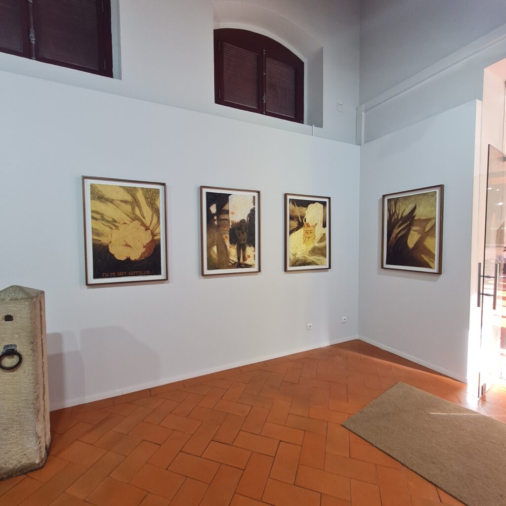 A exposição apresenta atmosferas soturnas, ricas em simbolismos enigmáticos. O uso pontual de texto poético estabelece um diálogo com uma figuração que tende à subjetividade.